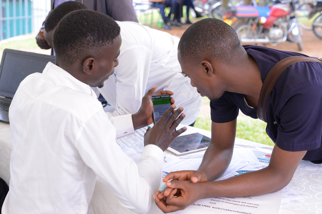 Student supporting fellow student to enrol on the MUST LMS using a mobile device during a physical campaign organised by the e-learning Initiative.