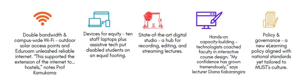 “Double bandwidth & campus‑wide Wi‑Fi – outdoor solar access points and Eduroam unleashed reliable internet. “This supported the extension of the internet to… hostels,” notes Prof Kamukama.