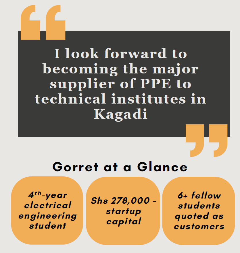 Gorret’s business quickly addressed a critical need among her fellow engineering students. “As students at the faculty of Engineering, we are required to have personal protective equipment for practical lessons and internships,” explains Adrona Juliet Kagoola. “In year one, I bought protective equipment from outside campus, and it was extremely hard and costly as all the major neighbourhood towns (Tororo, Busia, Iganga, and Jinja) did not have most of the required equipment, and what they had was of poor quality and often did not provide a variety to choose from. I had to purchase the equipment from Kampala, leading to high sourcing costs. Gorret’s business has solved a major problem for us as students, bringing these essential items close to us students but also providing a variety of brands that we can choose from based on what we like and price.